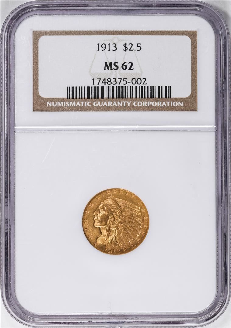 One 1913 $2 1/2 Indian Head Quarter Eagle Gold Coin NGC MS62. NGC Certified.