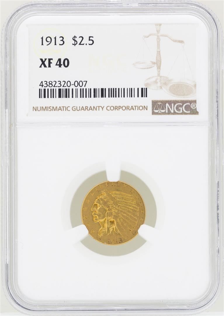 One 1913 $2 1/2 Indian Head Quarter Eagle Gold Coin NGC XF40. NGC Certified.