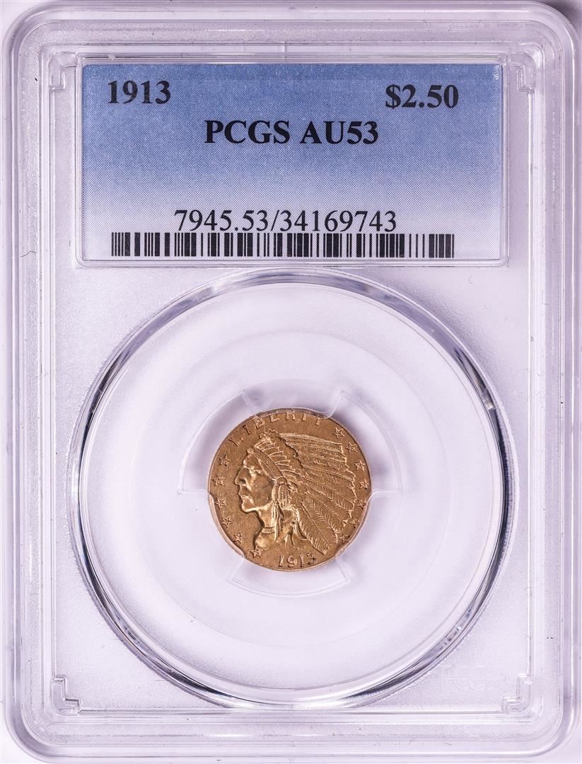 One 1913 $2 1/2 Indian Head Quarter Eagle Gold Coin PCGS AU53. PCGS Graded.