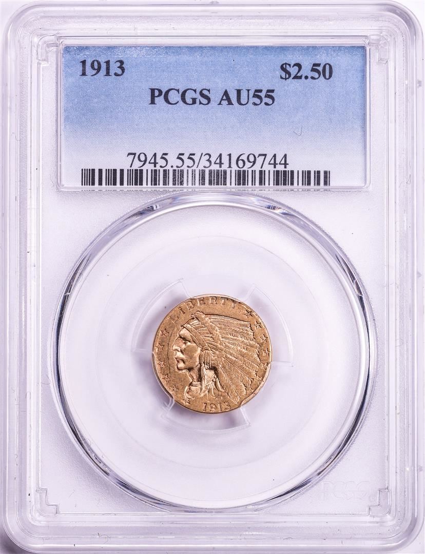 One 1913 $2 1/2 Indian Head Quarter Eagle Gold Coin PCGS AU55. PCGS Graded.