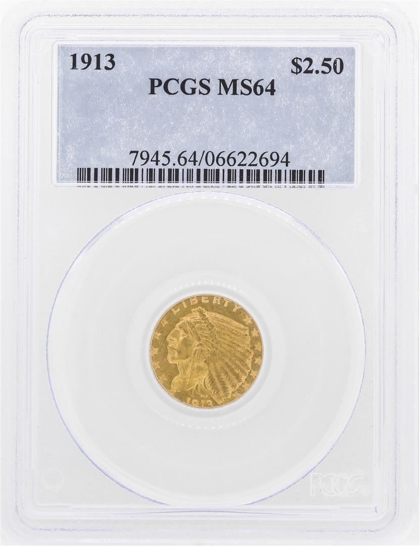 One 1913 $2 1/2 Indian Head Quarter Eagle Gold Coin PCGS MS64. PCGS Graded.