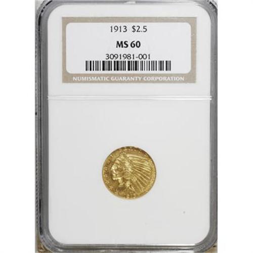 <B>1913 $2 1/2 MS60 NGC.</B></I> . NGC Census: (136/6707). PCGS Population (112/3324). Mintage: 722,000. Numismedia Wsl. Price for NGC/PCGS coin in MS60: $245. (#7945)<BR><BR><B>Coin Engraver:</B> Bela Lyon Pratt<BR><BR><b>Shipping:</b> Coins & Currency (<a target="_blank" href="http://www.heritageauctions.com/common/shipping.php">view shipping information</a>)