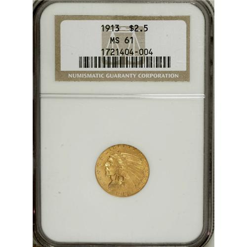 <B>1913 $2 1/2 MS61 NGC.</B></I> NGC Census: (1633/4503). PCGS Population (493/2535). Mintage: 722,000. Numismedia Wsl. Price: $352. (#7945)<BR><BR><b>Shipping:</b> Coins & Currency (<a target="_blank" href="http://www.heritageauctions.com/common/shipping.php">view shipping information</a>)
