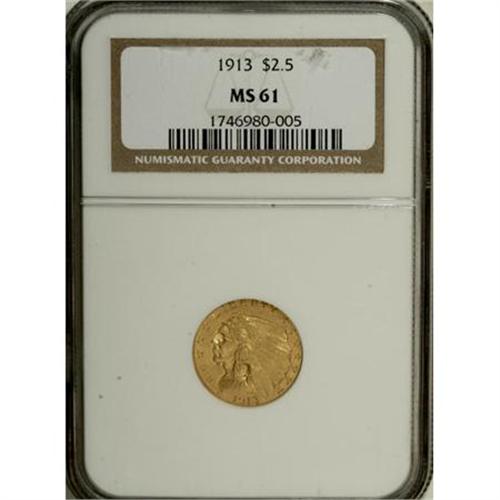 <B>1913 $2 1/2 MS61 NGC.</B></I> NGC Census: (1659/4556). PCGS Population (495/2545). Mintage: 722,000. Numismedia Wsl. Price for NGC/PCGS coin in MS61: $352. (#7945)<BR><BR><b>Shipping:</b> Coins & Currency (<a target="_blank" href="http://www.heritageauctions.com/common/shipping.php">view shipping information</a>)