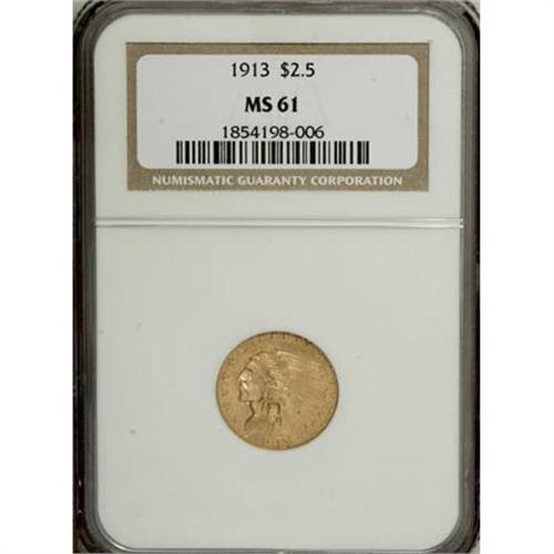 <B>1913 $2 1/2 MS61 NGC.</B></I> NGC Census: (1672/4610). PCGS Population (495/2545). Mintage: 722,000. Numismedia Wsl. Price for NGC/PCGS coin in MS61: $352. (#7945)<BR><BR><B>Coin Engraver:</B> Bela Lyon Pratt<BR><BR><b>Shipping:</b> Coins & Currency (<a target="_blank" href="http://www.heritageauctions.com/common/shipping.php">view shipping information</a>\)