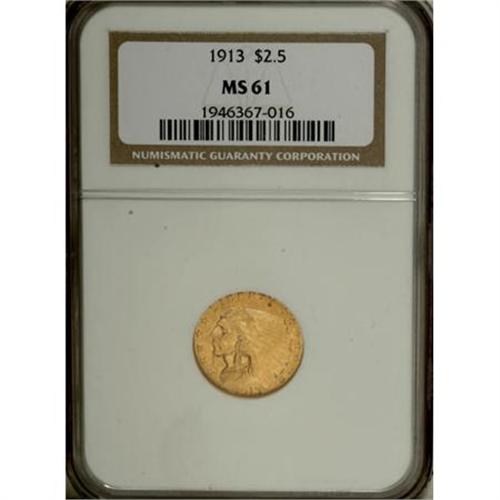 <B>1913 $2 1/2 MS61 NGC.</B></I> NGC Census: (1806/4982). PCGS Population (514/2905). Mintage: 722,000. Numismedia Wsl. Price for NGC/PCGS coin in MS61: $355. (#7945)<BR><BR><B>Coin Engraver:</B> Bela Lyon Pratt<BR><BR><b>Shipping:</b> Coins & Currency (<a target="_blank" href="http://www.heritageauctions.com/common/shipping.php">view shipping information</a>)