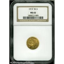 1913 $2 1/2 MS62 NGC. Bright yellow-gold surfaces <B>1913 $2 1/2 MS62 NGC.</B></I> Bright yellow-gold surfaces with minimal abrasions for the grade. <BR><BR><B>Important notice:</B> Heritage usually auctions material at the rate of 200-250 lots per hour. On some occasions eBay Live bid software or the Internet may not be able to keep up with the pace of the auction. We recommend placing a realistic absentee bid now as insurance to avoid disappointment. Occasionally the auctioneer may eliminate or reject an eBay Live bid, and the auctioneer may also reopen a lot after the close of the eBay live bidding (usually because we missed an audience bid), and may reject your bid even if it shows you as the winning bidder. By bidding via eBay Live, you agree that Heritage may award the lot to another bidder at its sole discretion under the circumstances described above or any other reasonable circumstances. Since eBay bids are not shown to us until we open the lot on the floor, we treat those bids just like floor bids. In most cases the floor responds before the eBay bid is presented to us, due to Internet lag time, so for consistency we have made it a policy that floor bids are always considered first over tie eBay live bids. Also please note that all Heritage lots purchased through eBay Live carry a 20% Buyer's Premium. Please make sure you read the Terms and Conditions before you bid. This lot is being auctioned in conjunction with a live floor auction by Heritage Galleries & Auctioneers. All final auction and invoice information will be supplied by Heritage Galleries & Auctioneers, and all other information should be considered preliminary. Lot:6557