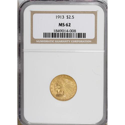 <B>1913 $2 1/2 MS62 NGC.</B></I> NGC Census: (2600/1880). PCGS Population (1139/1396). Mintage: 722,000. Numismedia Wsl. Price: $500. (#7945)<BR><BR><b>Shipping:</b> Coins & Currency (<a target="_blank" href="http://www.heritageauctions.com/common/shipping.php">view shipping information</a>)