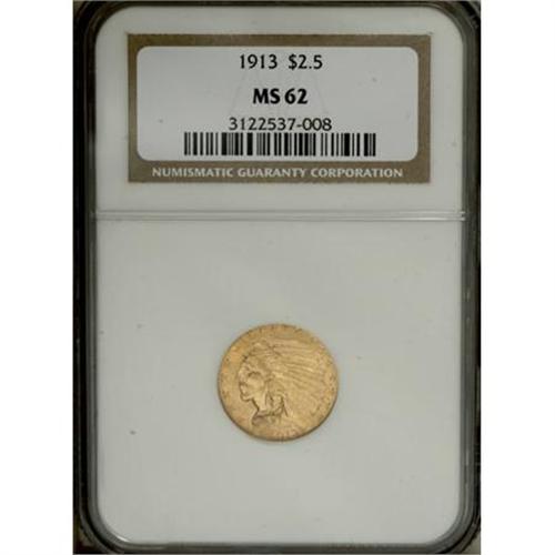 <B>1913 $2 1/2 MS62 NGC.</B></I> NGC Census: (2767/2020). PCGS Population (1216/1533). Mintage: 722,000. Numismedia Wsl. Price for NGC/PCGS coin in MS62: $500. (#7945)<BR><BR><B>Coin Engraver:</B> Bela Lyon Pratt<BR><BR><b>Shipping:</b> Coins & Currency (<a target="_blank" href="http://www.heritageauctions.com/common/shipping.php">view shipping information</a>)