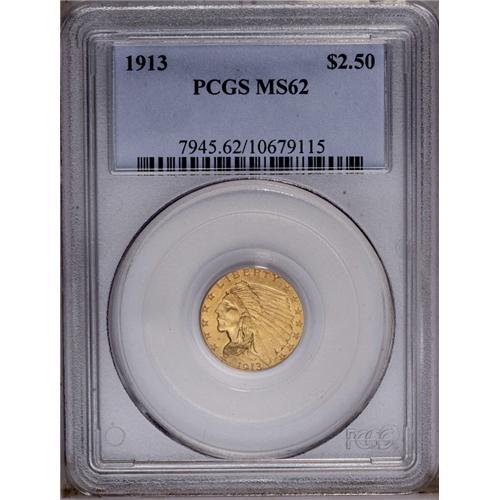 <B>1913<$2 1/2> MS62 PCGS.</B></I> Boldly struck with a smooth, matte-like appearance and nice honey-gold toning. The coin's few trivial marks can be counted on the fingers of one hand.