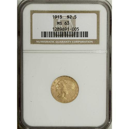 <B>1913 $2 1/2 MS63 NGC.</B></I> Soft luster emanates from brass-gold surfaces that reveal a few light handling marks. The design elements are well brought up.<BR><BR><b>Shipping:</b> Coin/Currency (<a target="_blank" href="http://www.heritageauctions.com/common/shipping.php">view shipping information</a>)