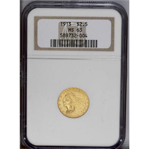 <B>1913<$2 1/2> MS63 NGC.</B></I> This specimen possesses defect-free surfaces and pleasing uniform color and luster. Truly a top-notch example of this popular short collectible series.