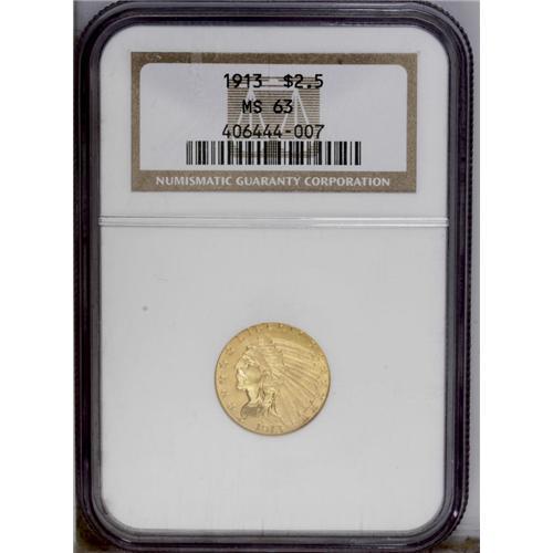 <B>1913<$2 1/2> MS63 NGC.</B></I> Yellow-gold colored with satiny luster throughout and ample definition in the incuse design elements. A fantastic type example that is sure to please its next owner. <BR><BR><B>Important notice:</B> Heritage usually auctions material at the rate of 200-250 lots per hour. On some occasions eBay Live bid software or the Internet may not be able to keep up with the pace of the auction. We recommend placing a realistic absentee bid now as insurance to avoid disappointment. Occasionally the auctioneer may eliminate or reject an eBay Live bid, and the auctioneer may also reopen a lot after the close of the eBay live bidding (usually because we missed an audience bid), and may reject your bid even if it shows you as the winning bidder. By bidding via eBay Live, you agree that Heritage may award the lot to another bidder at its sole discretion under the circumstances described above or any other reasonable circumstances. Since eBay bids are not shown to us until we open the lot on the floor, we treat those bids just like floor bids. In most cases the floor responds before the eBay bid is presented to us, due to Internet lag time, so for consistency we have made it a policy that floor bids are always considered first over tie eBay live bids. Also please note that all Heritage lots purchased through eBay Live carry a 20% Buyer's Premium. Please make sure you read the Terms and Conditions before you bid. This lot is being auctioned in conjunction with a live floor auction by Heritage Galleries & Auctioneers. All final auction and invoice information will be supplied by Heritage Galleries & Auctioneers, and all other information should be considered preliminary. Lot:2497 <BR><BR><B>Winning Notification and Billing:</B> After the FINAL session in this auction is complete, Heritage will send e-mail and snail mail invoices. This process normally takes several days. All final auction and invoice information will be supplied by Heritage Galleries & Auctioneers, and all other information should be considered preliminary. <BR><BR>This auction will be conducted on a live auction floor and over the Internet through eBay Live. If you choose to place an absentee bid, please take a moment to <font color='#0000ff'><u><a href='http://pages.ebay.com/liveauctions/help/before/laabsentee.html'>learn how eBay Live absentee bidding works</a></u></font><font color='#000000'>