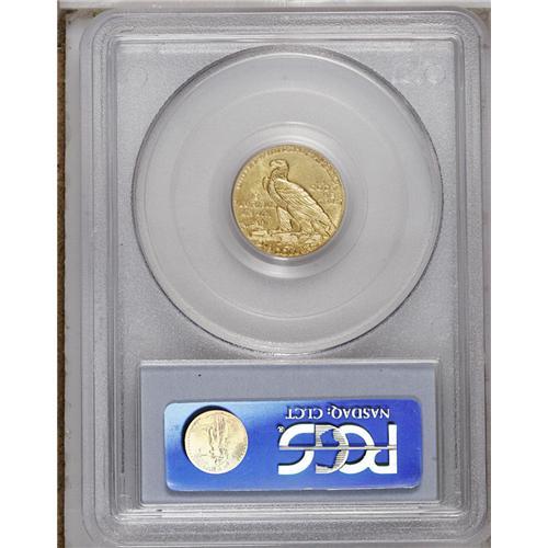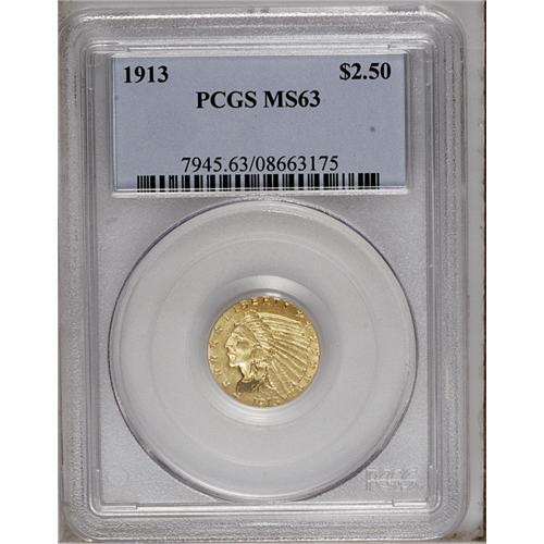 <B>1913<$2 1/2> MS63 PCGS.</B></I> A bright lemon-yellow piece that has solid central detail. Select with shallow abrasions on each side that partly account for the grade.