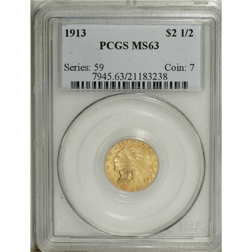 1913 $2 1/2 MS63 PCGS. A lustrous piece with orange go
