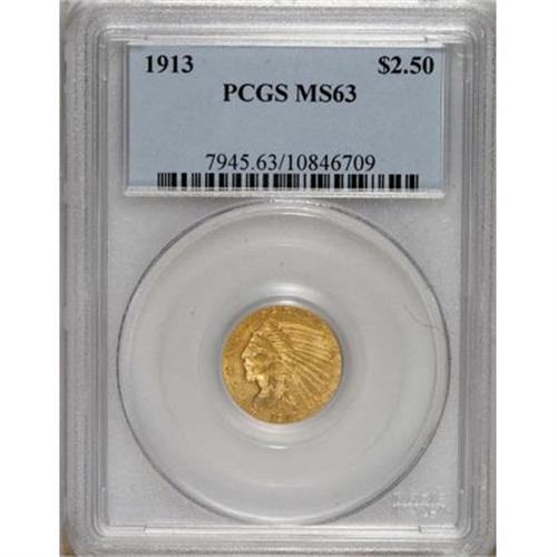 <B>1913 $2 1/2 MS63 PCGS.</B></I> Despite a series-high mintage of 722,000 pieces, the 1913 is less available in Mint State grades than the issues of the 1920s. This well-defined, subtly lustrous example has a butter-yellow obverse and deeper sunset-orange color on the reverse.<BR><BR><b>Shipping:</b> Coins & Currency (<a target="_blank" href="http://www.heritageauctions.com/common/shipping.php">view shipping information</a>)