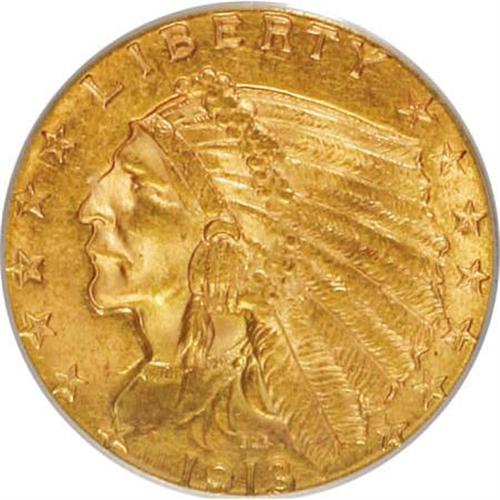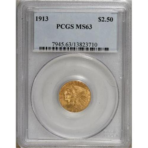 <B>1913 $2 1/2 MS63 PCGS.</B></I> PCGS Population (816/631). NGC Census: (1270/675). Mintage: 722,000. Numismedia Wsl. Price for NGC/PCGS coin in MS63: $925. (#7945)<BR><BR><B>Coin Engraver:</B> Bela Lyon Pratt<BR><BR><b>Shipping:</b> Coins & Currency (<a target="_blank" href="http://www.heritageauctions.com/common/shipping.php">view shipping information</a>\)
