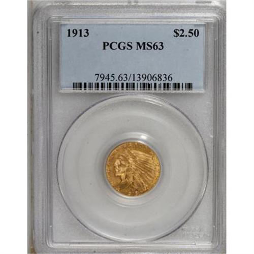 <B>1913 $2 1/2 MS63 PCGS.</B></I> Sharply struck with uncommonly vibrant luster for this P-mint issue. At first glance, this sun-gold quarter eagle appears finer than its Select grade, though closer inspection reveals faint, wispy abrasions.<BR><BR><B>Coin Engraver:</B> Bela Lyon Pratt<BR><BR><b>Shipping:</b> Coins & Currency (<a target="_blank" href="http://www.heritageauctions.com/common/shipping.php">view shipping information</a>)