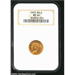 1913 $2 1/2 MS64 NGC. A boldly struck near-Gem that has radiant luster and carefully preserved surfaces. Orange-gold in color, and very attractive. Important notice: We expect to be auctioning lots at the rate of 200-250 per hour. Sometimes eBay Premier live bid software cannot keep up with that pace, so we strongly recommend that you place a realistic proxy bid now as insurance to avoid disappointment. Also please note that all Heritage/CAA lots purchased through eBay Premier carry a 20% Buyer's Premium. Please make sure you read the Terms and Conditions.