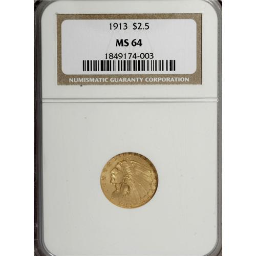 <B>1913 $2 1/2 MS64 NGC.</B></I> The highest-mintage Pratt quarter eagle issue; its production of 722,000 pieces just edges the 704,000 examples struck at Philadelphia in 1911. This Choice example is solidly struck with well-preserved and satiny orange-gold surfaces.<BR><BR><b>Shipping:</b> Coins & Currency (<a target="_blank" href="http://www.heritageauctions.com/common/shipping.php">view shipping information</a>)
