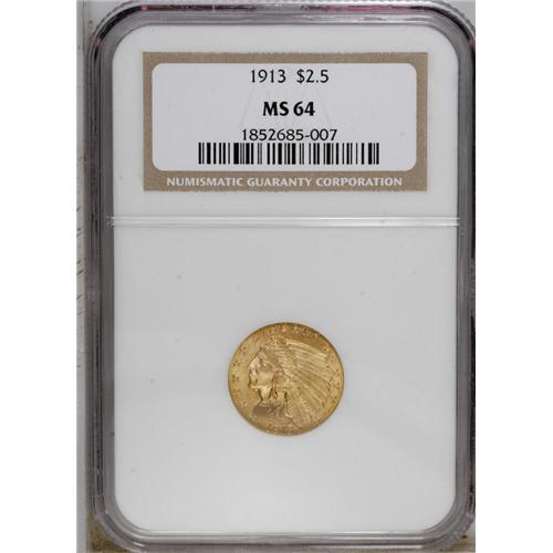 <B>1913 $2 1/2 MS64 NGC.</B></I> The honey-gold surfaces have pleasing, satiny luster. An impressively struck example with a few small marks on the portrait that preclude Gem status.<BR><BR><b>Shipping:</b> Coin/Currency (<a target="_blank" href="http://www.heritageauctions.com/common/shipping.php">view shipping information</a>)