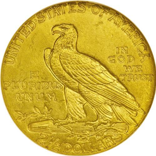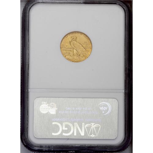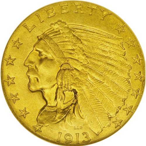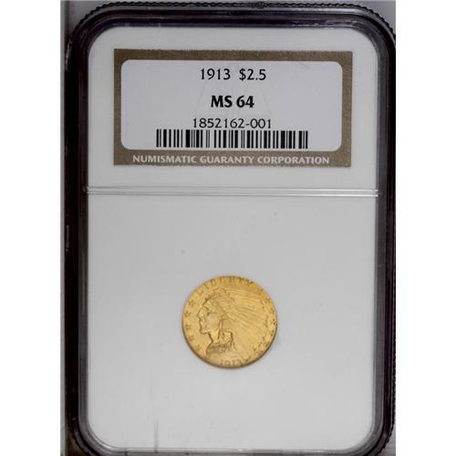 <B>1913<$2 1/2> MS64 NGC.</B></I> This example is quite boldly struck; the sunken relief area at the Indian's neck seems positively cavernous. The satiny orange-gold surfaces show only a few tiny marks, although these are enough to keep it from the Gem category. Great overall eye appeal.
