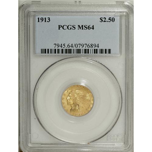 <B>1913 $2 1/2 MS64 PCGS.</B></I> A solidly struck and highly lustrous yellow-gold example that has hints of orange and green on each side. A handful of thin abrasions project from the Indian's nose.<BR><BR><b>Shipping:</b> Coin/Currency (<a target="_blank" href="http://www.heritageauctions.com/common/shipping.php">view shipping information</a>)