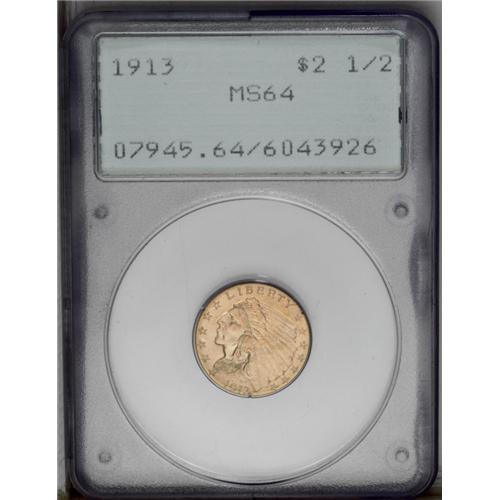 <B>1913 $2 1/2 MS64 PCGS.</B></I> A well-defined and lustrous piece that has light marks scattered over the surfaces. This wheat-gold near-Gem is housed in a first-generation holder.<BR><BR><b>Shipping:</b> Coin/Currency (<a target="_blank" href="http://www.heritageauctions.com/common/shipping.php">view shipping information</a>)