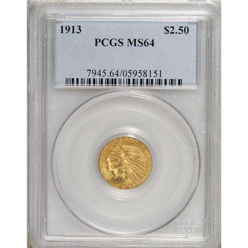 1913 $2 1/2 MS64 PCGS. At 722,000 pieces, the 1913 has