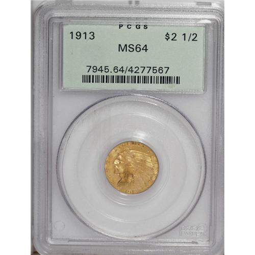<B>1913 $2 1/2 MS64 PCGS.</B></I> The vivid yellow-orange surfaces have pretty luster, and the devices are suitably impressed. Several scratches on the front of the holder have no effect on the coin.<BR><BR><b>Shipping:</b> Coin/Currency (<a target="_blank" href="http://www.heritageauctions.com/common/shipping.php">view shipping information</a>)