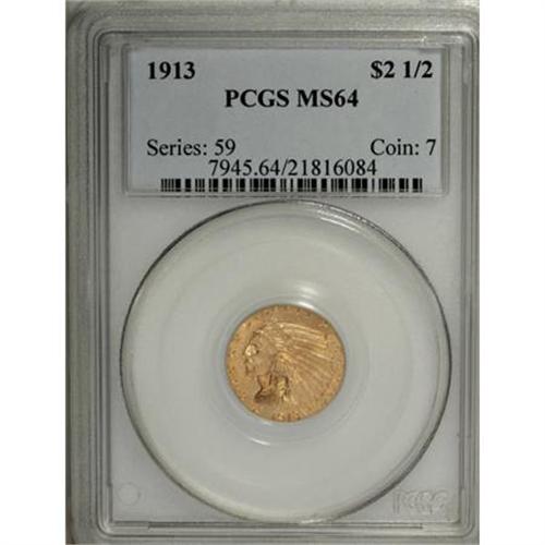 <B>1913 $2 1/2 MS64 PCGS.</B></I> Vibrant sun-gold surfaces with faint elements of green show ample luster. Well-defined overall, though the necklace is more outlined than sculptural. PCGS has graded 87 finer pieces (1/08).<BR><BR><B>Coin Engraver:</B> Bela Lyon Pratt<BR><BR><b>Shipping:</b> Coins & Currency (<a target="_blank" href="http://www.heritageauctions.com/common/shipping.php">view shipping information</a>)