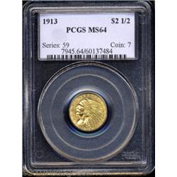 <TABLE cellSpacing=0 cellPadding=0 width="100%" bgColor=#000000 border=0><TBODY><TR><TD width="100%"><TABLE cellSpacing=1 cellPadding=3 width="100%" border=0><TBODY><TR><TD width="100%" bgColor=#79735c><FONT face=arial color=#ffffff size=3><B>Description</B> </FONT></TD></TR><TR><TD width="100%" bgColor=#ffffff><FONT face=arial size=2><B>1913 $2 1/2 MS64 PCGS.</B></I> Even orange surfaces with good original mint luster. A small pin prick on the Indian's cheek and a few streaks of darker color on the reverse are noted for accuracy. The few faint wispy handling marks expected for this grade are exceedingly minor. </FONT></TD></TR></TBODY></TABLE></TD></TR></TBODY></TABLE><BR><A name=PricesRealized></A><TABLE cellSpacing=0 cellPadding=0 width="100%" bgColor=#000000 border=0><TBODY><TR><TD width="100%"><TABLE cellSpacing=1 cellPadding=3 width="100%" border=0><TBODY><TR><TD width="100%" bgColor=#79735c><A name=PR><FONT face=arial color=#ffffff size=3><B>Previous Prices from Heritage Auctions</B> </FONT></A></TD></TR><TR><TD bgColor=#f6f6ed><TABLE cellSpacing=0 cellPadding=0 width="100%" border=1><TBODY><TR><TD align=middle width="33%"><B>Date</B></TD><TD align=middle width="33%"><B>Service</B></TD><TD align=middle width="33%"><B>Price</B></TD></TR><TR bgColor=whitesmoke><TD width="33%"><B>06/07/2000</B></TD><TD width="33%">PCGS</TD><TD width="33%">$747.50</TD></TR><TR bgColor=whitesmoke><TD width="33%"><B>04/30/1993</B></TD><TD width="33%">PCGS</TD><TD width="33%">$2,310.00</TD></TR><TR bgColor=whitesmoke><TD width="33%"><B>11/23/2002</B></TD><TD width="33%">NGC</TD><TD width="33%">$2,530.00</TD></TR><TR bgColor=whitesmoke><TD width="33%"><B>02/01/2001</B></TD><TD width="33%">NGC</TD><TD width="33%">$1,064.00</TD></TR><TR bgColor=whitesmoke><TD width="33%"><B>08/08/2001</B></TD><TD width="33%">NGC</TD><TD width="33%">$1,495.00</TD></TR><TR bgColor=whitesmoke><TD width="33%"><B>01/01/1994</B></TD><TD width="33%">PCGS</TD><TD width="33%">$2,008.00</TD></TR><TR bgColor=whitesmoke><TD width="33%"><B>05/01/1996</B></TD><TD width="33%">PCGS</TD><TD width="33%">$1,276.00</TD></TR><TR bgColor=whitesmoke><TD width="33%"><B>09/01/1998</B></TD><TD width="33%">PCGS</TD><TD width="33%">$1,155.00</TD></TR><TR bgColor=whitesmoke><TD width="33%"><B>05/06/2003</B></TD><TD width="33%">PCGS</TD><TD width="33%">$1,840.00</TD></TR><TR bgColor=whitesmoke><TD width="33%"><B>05/01/2001</B></TD><TD width="33%">PCGS</TD><TD width="33%">$1,323.00</TD></TR><TR bgColor=whitesmoke><TD width="33%"><B>07/18/2000</B></TD><TD width="33%">NGC</TD><TD width="33%">$800.00</TD></TR><TR bgColor=whitesmoke><TD width="33%"><B>07/29/1997</B></TD><TD width="33%">NGC</TD><TD width="33%">$880.00</TD></TR><TR bgColor=whitesmoke><TD width="33%"><B>03/02/1995</B></TD><TD width="33%">NGC</TD><TD width="33%">$1,320.00</TD></TR><TR bgColor=whitesmoke><TD width="33%"><B>06/10/2000</B></TD><TD width="33%">PCGS</TD><TD width="33%">$862.50</TD></TR><TR bgColor=whitesmoke><TD width="33%"><B>06/04/1995</B></TD><TD width="33%">PCGS</TD><TD width="33%">$2,970.00</TD></TR><TR bgColor=whitesmoke><TD width="33%"><B>08/13/1999</B></TD><TD width="33%">PCGS</TD><TD width="33%">$1,725.00</TD></TR><TR bgColor=whitesmoke><TD width="33%"><B>04/14/2000</B></TD><TD width="33%">NGC</TD><TD width="33%">$948.75</TD></TR></TBODY></TABLE></TD></TR><TR><TD bgColor=#ffffff><FONT face=arial size=1 ?>PLEASE NOTE: All prices realized reflect the final hammer price PLUS the buyer's premium in auctions that charge a buyer's premium. Each item has a notation at the top of the listing indicating whether that lot included a buyer's premium. Example: A item that sells with a final hammer price of $100 and a 20% buyer's premium will display with a price realized of $120. All information listed is intended to be as accurate as possible, but errors are possible. Please use this guide carefully and inform us of any inaccuracies. </FONT></TD></TR></TBODY></TABLE></TD></TR></TBODY></TABLE><BR><TABLE cellSpacing=0 cellPadding=0 width="100%" bgColor=#000000 border=0><TBODY><TR><TD width="100%"><TABLE cellSpacing=1 cellPadding=3 width="100%" border=0><TBODY><TR><TD width="100%" bgColor=#79735c colSpan=6><FONT face=arial color=#ffffff size=3><B>Price Guide*</B> </FONT></TD></TR><TR bgColor=#f6f6ed><TD align=middle><B>Grade</B> </TD><TD align=middle><B>Coin World<BR>(Trends)</B> </TD><TD align=middle><B>Numismedia<BR>Retail</B> </TD><TD align=middle><B>Numismedia<BR>Wholesale</B> </TD><TD align=middle><B>Coin<BR>Universe</B> </TD><TD align=middle><B>Heritage<BR>Value Index</B> </TD></TR><TR bgColor=#ffffff><TD align=middle>63</TD><TD align=right>$1,400.00</TD><TD align=right>---</TD><TD align=right>$935.00</TD><TD align=right>$1,100.00</TD><TD align=right>$927.25</TD></TR><TR style="FONT-WEIGHT: bold" bgColor=#cccfdd><TD align=middle>64</TD><TD align=right>$2,500.00</TD><TD align=right>---</TD><TD align=right>$1,675.00</TD><TD align=right>$2,000.00</TD><TD align=right>$1,667.50</TD></TR><TR bgColor=#ffffff><TD align=middle>65</TD><TD align=right>$5,850.00</TD><TD align=right>---</TD><TD align=right>$4,575.00</TD><TD align=right>$6,750.00</TD><TD align=right>$4,402.50</TD></TR><TR bgColor=#ffffff><TD colSpan=6><FONT size=1>*All information listed is intended to be as accurate as possible, but errors are possible. No item may be returned or refused based on this information which is provided as a service to our customers. You should contact each pricing source directly to determine the accuracy of this information. </FONT></TD></TR></TBODY></TABLE></TD></TR></TBODY></TABLE><BR><TABLE cellSpacing=0 cellPadding=0 width="100%" bgColor=#000000 border=0><TBODY><TR><TD width="100%"><TABLE cellSpacing=1 cellPadding=3 width="100%" border=0><TBODY><TR><TD width="100%" bgColor=#79735c><FONT face=arial color=#ffffff size=3><B>Population Guide</B> </FONT></TD></TR><TR bgColor=#ffffff><TD align=middle><!-- Begin Output of Population Grid--><TABLE cellSpacing=0 cellPadding=0 width="100%" border=0><TBODY>