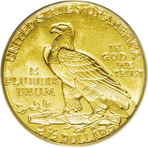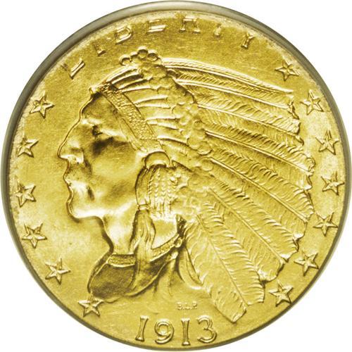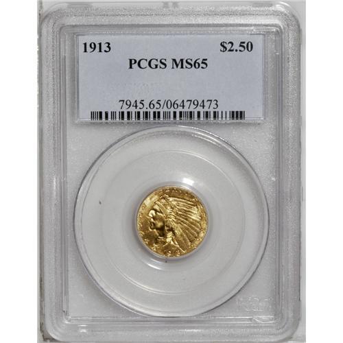 <B>1913<$2 1/2> MS65 PCGS.</B></I> Like the preceding four P-mint issues, the 1913 quarter eagle is an underappreciated coin that is infrequently offered in Gem Brilliant Uncirculated condition. An exceptionally bright yellow-golden survivor, the surfaces are moderately frosted with a typically sharp strike for the issue. Both sides are nicely preserved with a noticeable lack of distractions, save for a couple of tiny marks at the left side of the reverse. All but unobtainable any finer. Population: 73 in 65, 5 finer (7/06).