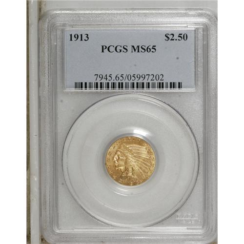 <B>1913 $2 1/2 MS65 PCGS.</B></I> The 1913 has the highest mintage among Indian Head quarter eagles (722,000 business strikes). Several thousand pieces have been certified by PCGS and NGC through the MS64 grade level, after which there is a precipitous drop in MS65 specimens. The overall eye appeal of this example is remarkable, and only a handful of tiny marks are present on each side. The devices are well struck, and the apricot-gold surfaces display pleasing luster and tints of light green. Population: 80 in 65, 5 finer (2/07).<BR><BR><b>Shipping:</b> Coins & Currency (<a target="_blank" href="http://www.heritageauctions.com/common/shipping.php">view shipping information</a>)