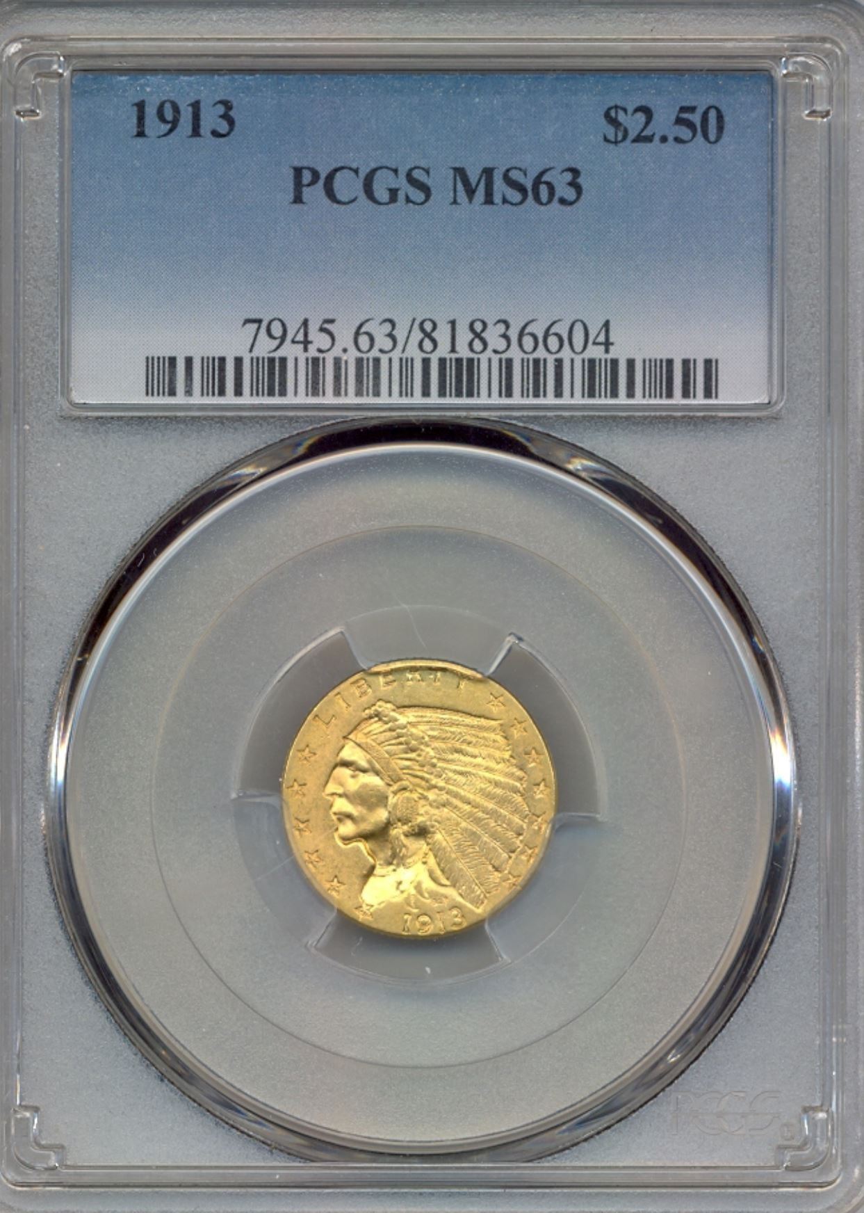 One 1913 $2.5 Indian Head Quarter Eagle Gold Coin PCGS MS63.