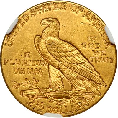 1913 $2.50 Indian. NGC graded AU-55. Toned, this one too has plenty of mint frost residing in the fields (PCGS # 7945).