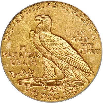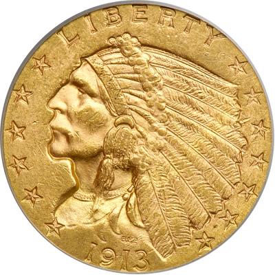 1913 $2.50 Indian. PCGS graded MS-62. Light golden toning.