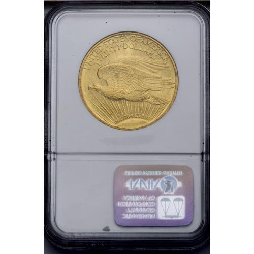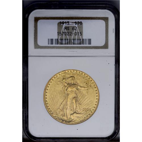 <B>1913<$20> MS62 NGC.</B></I> Pleasing luster invigorates the shimmering surfaces that display light green and peach toning. A number of small to moderate abrasions define the grade.<BR><I>From The Steve Glenn Collection.</B></I> <BR><BR><B>Important notice:</B> Heritage usually auctions material at the rate of 200-250 lots per hour. On some occasions eBay Live bid software or the Internet may not be able to keep up with the pace of the auction. We recommend placing a realistic absentee bid now as insurance to avoid disappointment. Occasionally the auctioneer may eliminate or reject an eBay Live bid, and the auctioneer may also reopen a lot after the close of the eBay live bidding (usually because we missed an audience bid), and may reject your bid even if it shows you as the winning bidder. By bidding via eBay Live, you agree that Heritage may award the lot to another bidder at its sole discretion under the circumstances described above or any other reasonable circumstances. Since eBay bids are not shown to us until we open the lot on the floor, we treat those bids just like floor bids. In most cases the floor responds before the eBay bid is presented to us, due to Internet lag time, so for consistency we have made it a policy that floor bids are always considered first over tie eBay live bids. Also please note that all Heritage lots purchased through eBay Live carry a 20% Buyer's Premium. Please make sure you read the Terms and Conditions before you bid. This lot is being auctioned in conjunction with a live floor auction by Heritage Galleries & Auctioneers. All final auction and invoice information will be supplied by Heritage Galleries & Auctioneers, and all other information should be considered preliminary. Lot:4625 <BR><BR><B>Winning Notification and Billing:</B> After the FINAL session in this auction is complete, Heritage will send e-mail and snail mail invoices. This process normally takes several days. All final auction and invoice information will be supplied by Heritage Galleries & Auctioneers, and all other information should be considered preliminary. <BR><BR>This auction will be conducted on a live auction floor and over the Internet through eBay Live. If you choose to place an absentee bid, please take a moment to <font color='#0000ff'><u><a href='http://pages.ebay.com/liveauctions/help/before/laabsentee.html'>learn how eBay Live absentee bidding works</a></u></font><font color='#000000'>