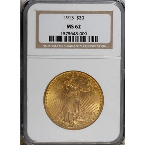 <B>1913 $20 MS62 NGC.</B></I> NGC Census: (804/451). PCGS Population (567/728). Mintage: 168,700. Numismedia Wsl. Price for NGC/PCGS coin in MS62: $900. (#9161)<BR><BR><B>Coin Engraver:</B> Augustus Saint-Gaudens<BR><BR><b>Shipping:</b> Coins & Currency (<a target="_blank" href="http://www.heritageauctions.com/common/shipping.php">view shipping information</a>\)