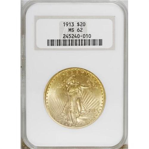 <B>1913 $20 MS62 NGC.</B></I> NGC Census: (827/464). PCGS Population (629/787). Mintage: 168,700. Numismedia Wsl. Price for NGC/PCGS coin in MS62: $900. (#9161)<BR><BR><B>Coin Engraver:</B> Augustus Saint-Gaudens<BR><BR><b>Shipping:</b> Coins & Currency (<a target="_blank" href="http://www.heritageauctions.com/common/shipping.php">view shipping information</a>)