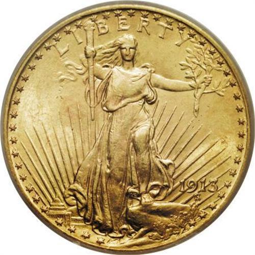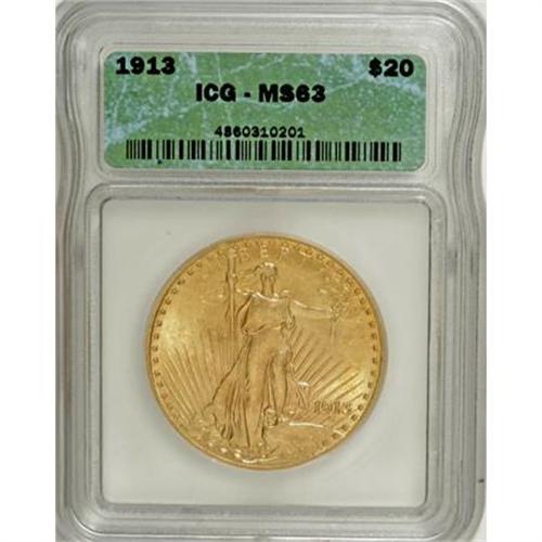 <B>1913 $20 MS63 ICG.</B></I> This 1913 twenty exhibits above-average striking sharpness. The Capitol building, Liberty's toes and fingers, on the right (facing) hand, and the eagle's feathers display good delineation. Both sides show potent luster and pleasing peach-gold patination laced with tinges of light green. Minute marks scattered over each side preclude a higher grade level.<BR><BR><B>Coin Engraver:</B> Augustus Saint-Gaudens<BR><BR><b>Shipping:</b> Coins & Currency (<a target="_blank" href="http://www.heritageauctions.com/common/shipping.php">view shipping information</a>)