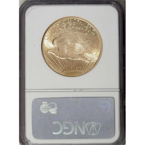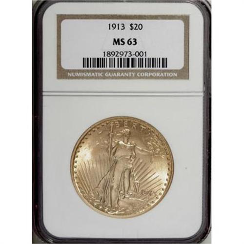 <B>1913 $20 MS63 NGC.</B></I> A bright, Select representative that is slightly brassy and straw-gold with a touch of emerald in the obverse fields. The reverse has more typical cartwheel luster with a hint of frost. Minimally marked for the grade and a pleasing example from the years just before the Great War.<BR><BR><B>Coin Engraver:</B> Augustus Saint-Gaudens<BR><BR><b>Shipping:</b> Coins & Currency (<a target="_blank" href="http://www.heritageauctions.com/common/shipping.php">view shipping information</a>\)
