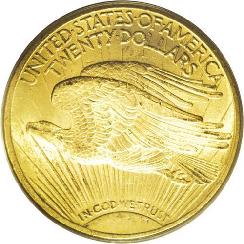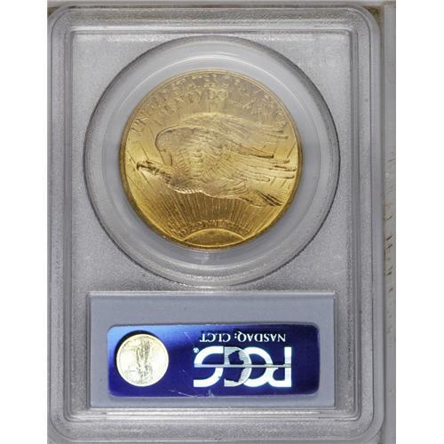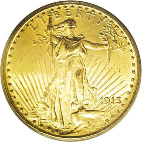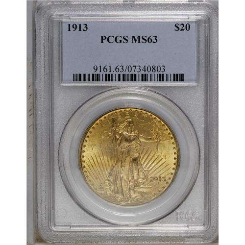 <B>1913<$20> MS63 PCGS.</B></I> All of the elegant design motifs are crisply defined and the bright surfaces display a frosty sheen over each side. A mildly scuffy appearance on each side is noticeable mainly on the central devices. The 1913 is a popular issue with an original production run of only 168,838 pieces.