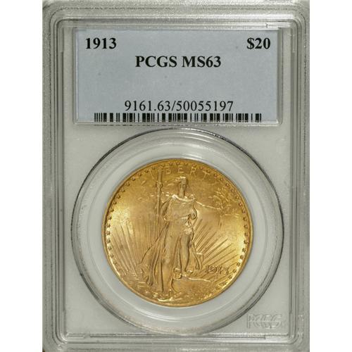 1913 $20 MS63 PCGS. Boldly struck and lustrous, with v