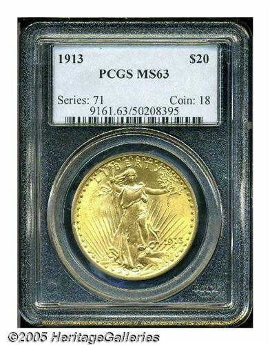 <B>1913<$20> MS63 PCGS.</B></I> Rich green-golden color with few appreciable marks. One of the more elusive P-mint Saints, particularly as the grade reaches MS63 or higher.
