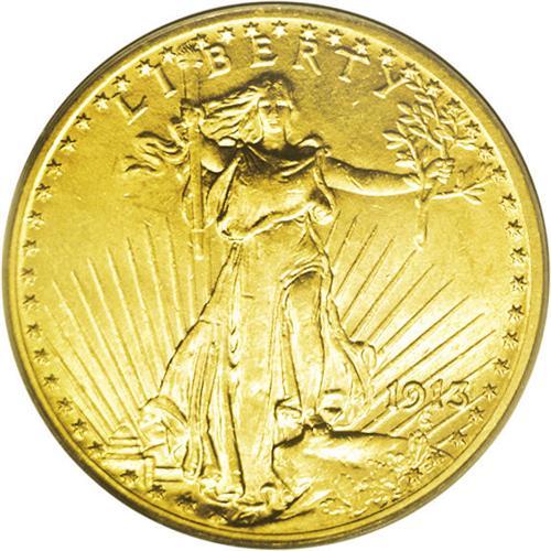 <B>1913<$20> MS63 PCGS.</B></I> The bright, semi-prooflike surfaces of this enticing example have a rich reddish-gold color. A typical number of small abrasions are noted on each side, for the grade. In terms of rarity, the 1913 is essentially equal to the 1912, but considerably less rare than the 1914, according to Akers.