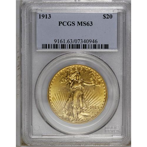 1913 $20 MS63 PCGS. The bright, semi-prooflike surface