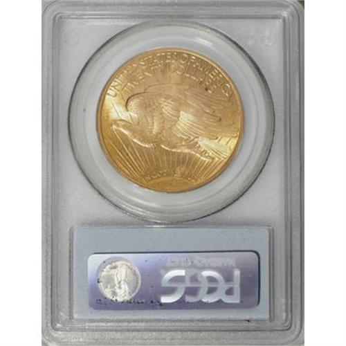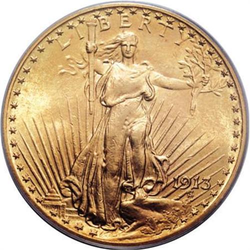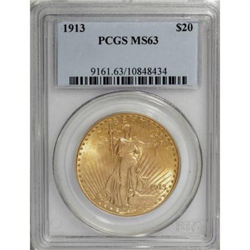 <B>1913 $20 MS63 PCGS.</B></I> Somewhat available despite a small output of less than 169,000 pieces, though this issue's comparatively high survival rate does not completely negate the effect of the mintage. The lustrous surfaces of this Select representative are predominantly orange-gold with slightly lighter color on the faintly abraded reverse. Appealing despite its flaws.<BR><BR><B>Coin Engraver:</B> Augustus Saint-Gaudens<BR><BR><b>Shipping:</b> Coins & Currency (<a target="_blank" href="http://www.heritageauctions.com/common/shipping.php">view shipping information</a>\)
