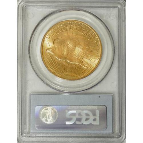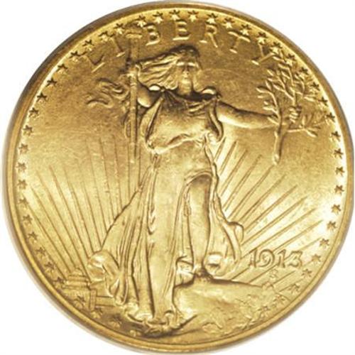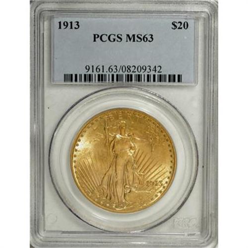 <B>1913 $20 MS63 PCGS.</B></I> Mintages of the 1913 double eagle slowed as the gold stopped flowing across most international borders, and those struck stayed close by in Eastern banks. This Select Mint State piece has frosty lemon-yellow color with a greenish-tan cast. The design elements are well impressed. Overall, quite pleasing for the grade.<BR><BR><B>Coin Engraver:</B> Augustus Saint-Gaudens<BR><BR><b>Shipping:</b> Coins & Currency (<a target="_blank" href="http://www.heritageauctions.com/common/shipping.php">view shipping information</a>)
