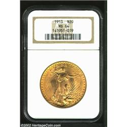 1913 $20 MS64 NGC. Richly colored with thick mint luster on each side, the devices are sharply struck and there are only a few small abrasions present on either side. A scarce issue that is always in demand by collectors. Important notice: We expect to be auctioning lots at the rate of 200-250 per hour. Sometimes eBay Premier live bid software cannot keep up with that pace, so we strongly recommend that you place a realistic proxy bid now as insurance to avoid disappointment. Also please note that all Heritage/CAA lots purchased through eBay Premier carry a 20% Buyer's Premium. Please make sure you read the Terms and Conditions.